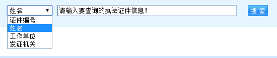 选择姓名、编号、工作机关或者发证机关,再输入相关的执法证件信息,点搜过即可。