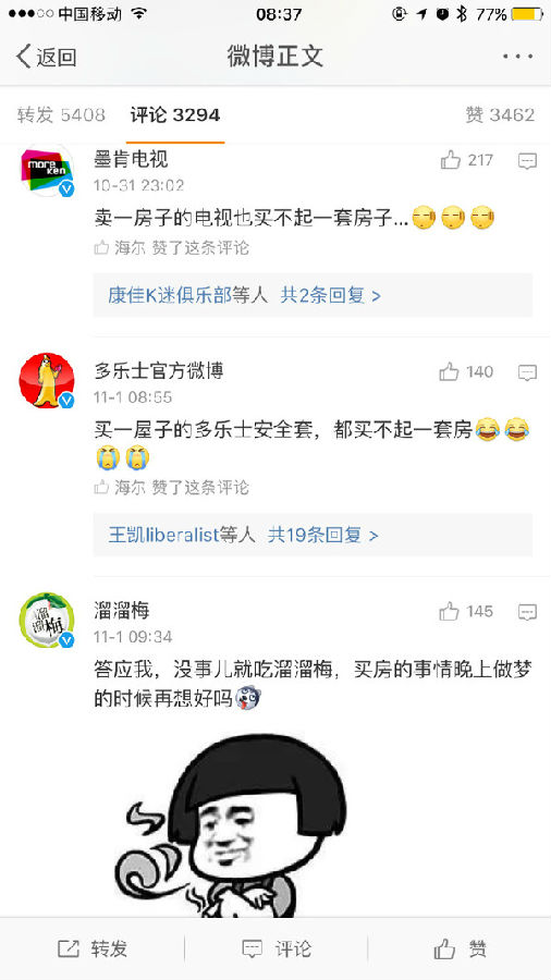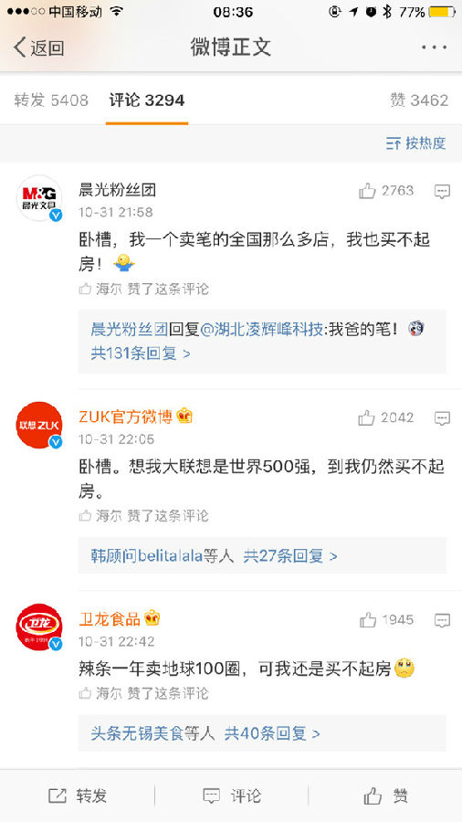 在海尔回应王健林的那条“但我还是买不起房”的官微底下,几乎把所有蓝微都炸出来了,接龙轰轰烈烈上演。