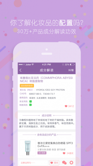 提供化妆品安全星级和成分查询的APP。精准匹配16种肤质。