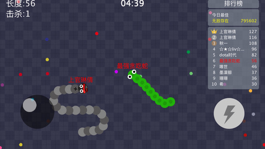 2.灵活走位,小蛇也能逆袭!避开敌蛇的同时也要讲究策略的哦,怎样让他撞到你的身上从而干掉他是很考验智商的哦!