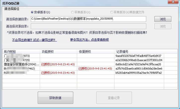 3、打开软件,将导出的“数据目录”输入,点击“获取数据”按钮。列表中会显示出来解密成功的QQ记录、授权状态和记录编号。(如果使用一键导出则会自动完成输入和获取)