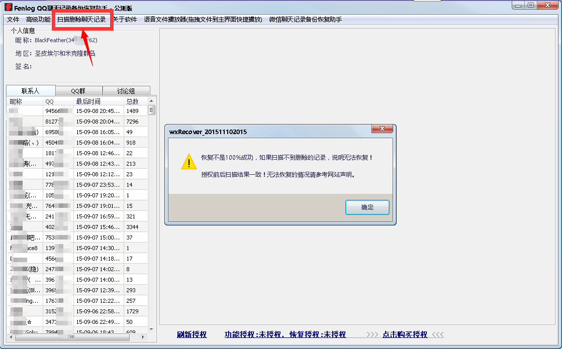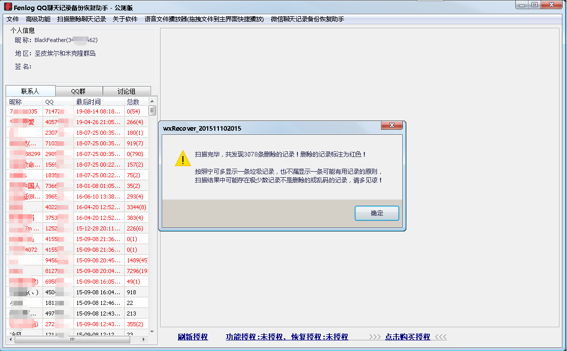 5、扫描完毕后,好友列表会自动刷新。标红的表示有恢复出来的记录,数字的意思是:“正常查看的条数(恢复出来的记录数)”。通过“扫描删除记录”扫描出来的红色的记录为可以恢复的删除的记录,如果扫描不到说明无法恢复。