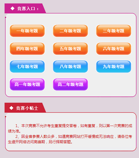 2、因全省参赛人数众多,如遇竞赛网站打开缓慢或无法响应,请各位考生避开网络访问高峰期,另行择期答题。