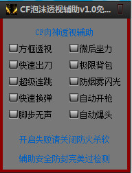 CF泡沫透视辅助这是一款CF透视辅助最新版2016游戏辅助,绿色无毒无插件的优秀辅助,有了它能够在游戏中方框透视、自动开枪、自动爆头、微后坐力等强力功能。让您成为路人大神,也将成为不败战神。快来下载使用吧!