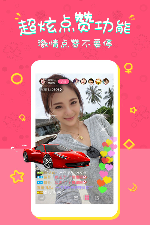 播主献上精彩直播,我只有疯狂,疯狂X2,疯狂X3……不断的疯狂点赞为Ta喝彩,不断的任性点赞感谢Ta带给你的快乐时光,不断的失去理智疯狂点赞鼓励Ta。