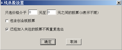 K线选股功能以‘组’为单位进行划分和管理。同一时刻最多只有一个组存在,若干组前后衔接起来完成了一系列的选股操作。每一组都是以点击菜单项‘启动新一组K线选股’这一动作开始的,点击菜单项后软件将以该时刻的行情数据为分析对象,执行一次基准选股操作。当再次‘启动新一组K线选股’时,将以新组代替旧的组,旧组结束,旧组中未被关注的股票将被清除。