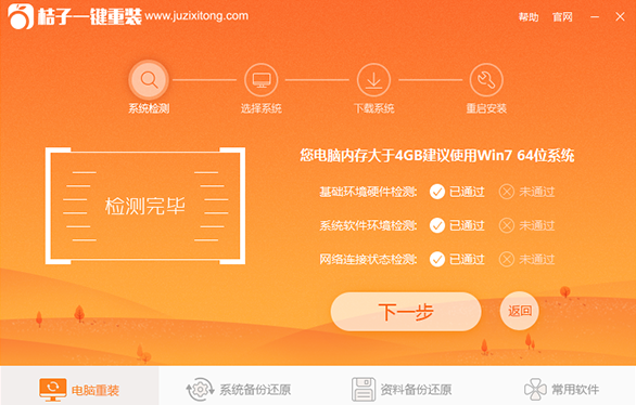 桔子一键重装工具会对系统智能检测然后给出最合适您的电脑系统。如下图中小编的电脑适合安装win764位系统。