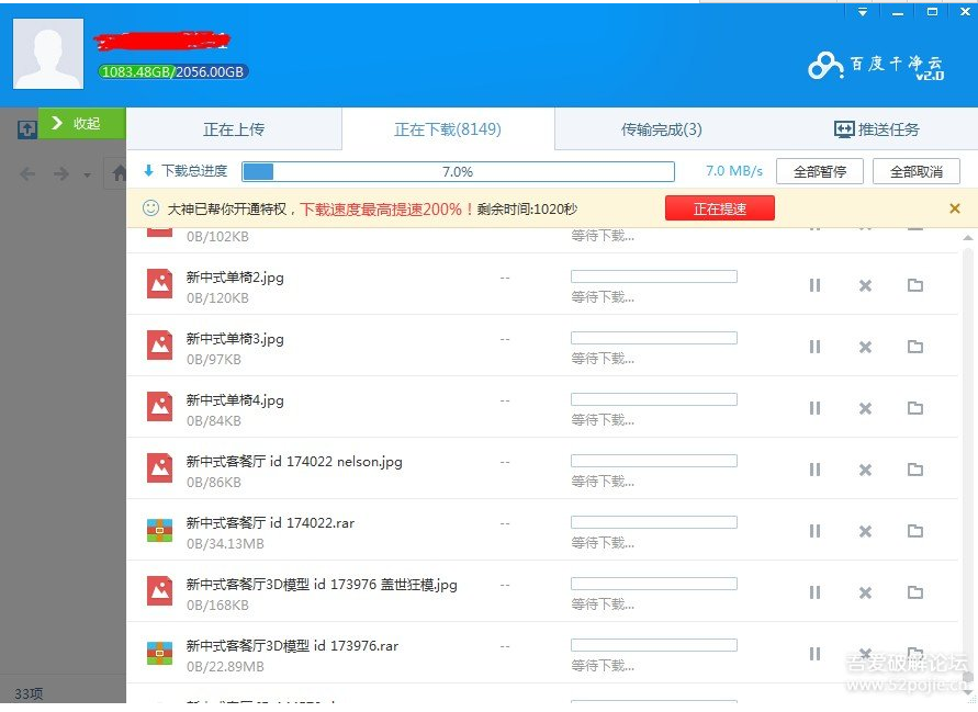 由于是搞家装设计专业的 百度网盘里存了很多3D模型 文件比较多 大概几百G 正常下载不知道到何年何月 就在吾爱里找破解版的 可是下载了很多个 全是限速了 最快的也只能到1M/S (家里宽度100M) 慢的只有几十KB
