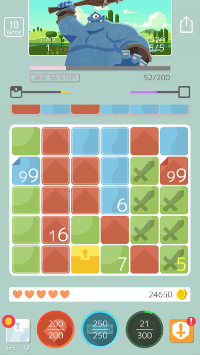 本作是一款通过点击不同颜色的方块累积数字,然后根据数字的大小给敌人造成伤害的消除RPG。当玩家加减乘除后得出的数字是10的倍数时,就可以一口气将所有的方块消除给予敌人极大的伤害。这时,学好数学的重要性就凸显出来了……