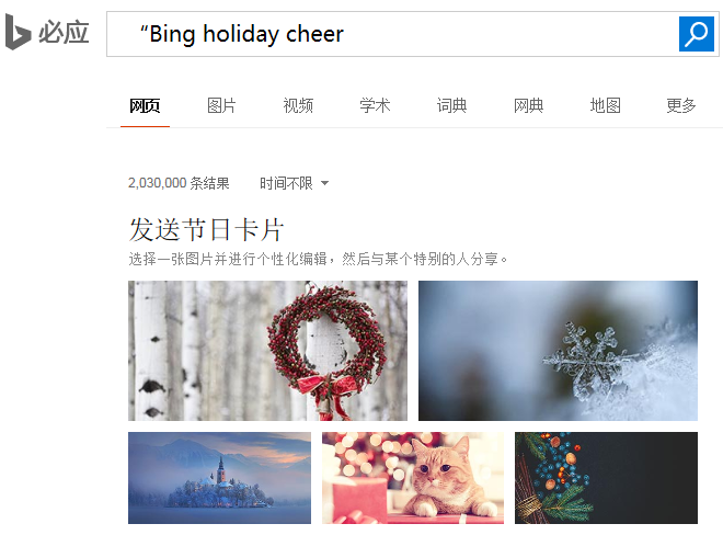 然后在搜索框中输入“Bing holiday cheer”,在搜索结果展示流中,第一条可以看到“发送节日卡片”,然后选择一张你中意的图片作为贺卡;