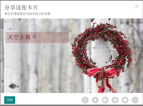 辑完成后点击“完成”,在右下角的图标中可以选择将贺卡分享到社交网络,或者邮件中,当然,也可以直接获取链接,通过QQ、微信等发送给好友。
