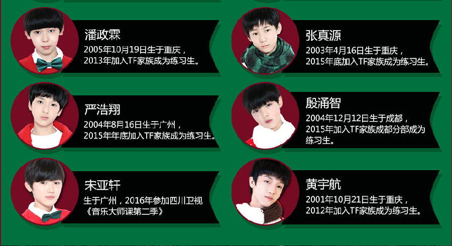 2、TF家族是国内第一个参照日韩等模式培养偶像明星的培训机构,全国第一个训练基地设在重庆,以重庆为起点,成功起步招收第一批训练生,并通过初期选拔→签约练习生→培训几个阶段进行新艺人培养。 随着时间的推移,今后TF家族会在全国娱乐氛围较强的省份建立培训部,继而发展为TF艺术发展基地,专业培训新艺人,及时往大陆娱乐市场注入新血液。