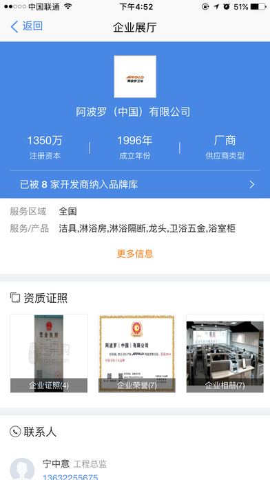 【统一通讯录】:名片、手机联系人、储存在电脑中的供应商联系人都能统一进行管理;可以看到联系人所在公司详情,包括企业基本信息、证照信息、资质信息等;