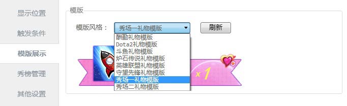 1.某水友送【赞】达到10个,就以【秀场二礼物模版】来展示送礼信息。