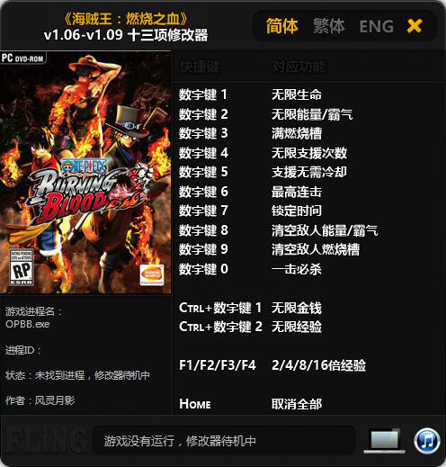 海贼王燃血十三项修改器风灵月影版是一款为广大《海贼王燃血》玩家打造的多功能辅助,该辅助拥有无限生命、无限能量/霸气、满燃烧槽等等功能,需要的玩家欢迎下载使用。