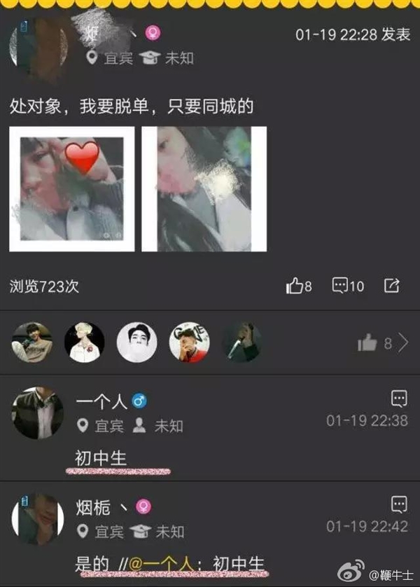 从图片来看,的确有自称初中生的用户在APP内发布交友信息,部分遣词和自拍露骨出位。