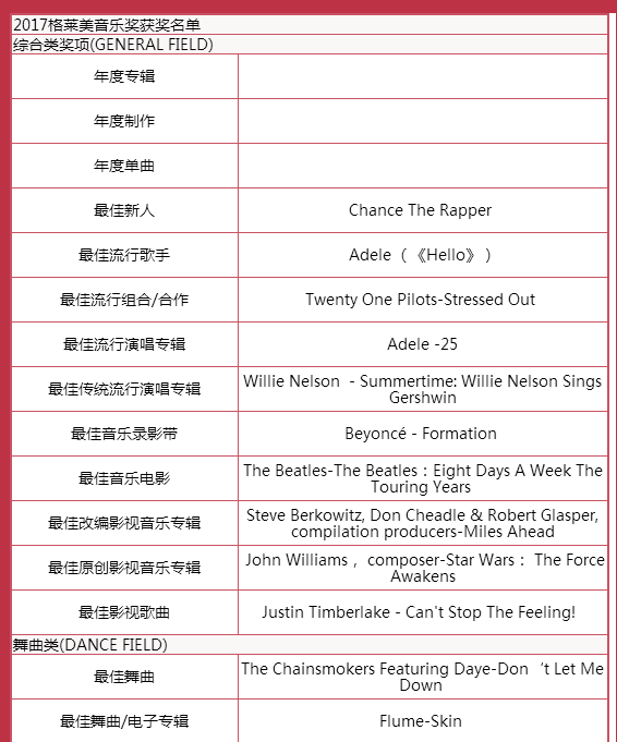 在综合类的四个奖项中,年度最佳专辑奖的预测是最难的。从表面上看,这将是碧昂斯与阿黛尔德雷克在竞争,但目前说谁稳操胜券都是不现实的,这个奖项爆冷的还少吗?