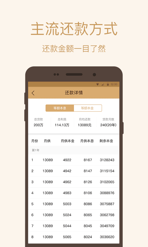 5.同时得到等额本息和等额本金的计算结果,方便对比;