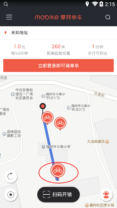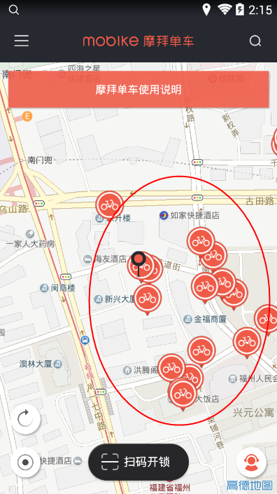 3.在线定位,获取附近单车地点,点击要取的单车