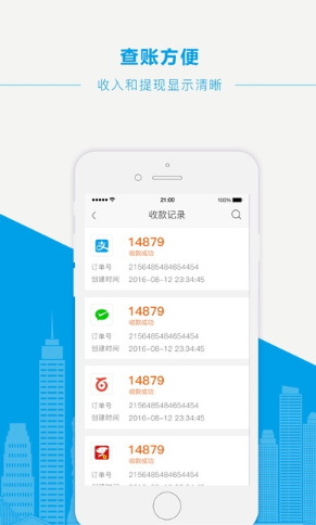 一款专门为小微商家量身打造的移动应用客户端,从此让用户摆脱原有繁琐的收款方式。能实现结算自由,查账清晰,收款方便,使操作简单化,界面美观化,功能系统化,收款安全化。