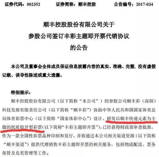 顺丰控股认为,丰彩主题即开票是全国首款能够将物流网络与彩票业务全面渗透和结合的产品。另外,“顺丰彩将通过顺丰渠道提供代理销售丰彩主题即开票的相关服务。”