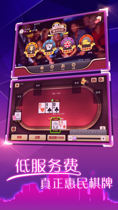 德州扑克欢乐版—服务费全网最低,按买入的5%收取,每手不抽水,离桌20分钟以内返回,会自动买入离桌前筹码且无需重复支付这部分筹码的收续费。发牌完全随机,概率随机,是全网真正公正公平的平台,是针对德扑爱好者最良心的棋牌游戏。