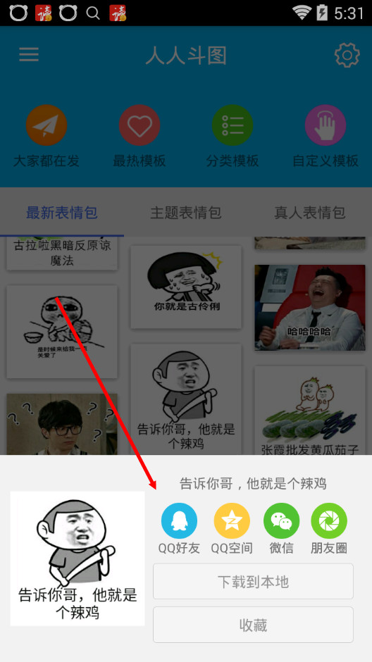 下载安装打开人人斗图表情包大全app,根据搜索选项选择自己想要保存的表情包,点击图片就会出现如下所示,然后你就可以选择下载或是直接发送微信qq好友或者直接发送到朋友群微信圈