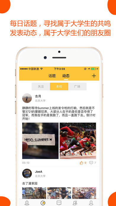 【个人动态,记录和直播属于自己的校园时光】:微信朋友圈人太多太杂,那就把自己想说的随性的发布到Summer的动态里面,可以查看本校人的动态和其他学校的人的动态,这里都是年轻大学生的朋友圈子。