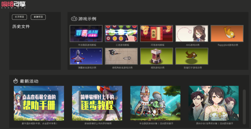 如果想通过一些例子来弄清楚唤境Evkworld的工作方式,您可以点击我们内置的游戏示例工程。点击游戏示例后,编辑器会先将游戏示例的工程保存到您的本地硬盘;请在弹出的文件浏览器中,选择您想保存到的位置;一旦保存完成,唤境Evkworld会自动打开工程。
