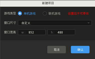 点击新建项目,即可创建新的空白项目。在弹出的对话框中,你可以设置项目的游戏类型和分辨率大小。在分辨率这里,我们事先预设了一些常用设备的分辨率,当然您也可以自己随意设置。