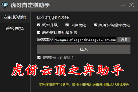 虎伢云顶之弈助手可以为玩家们提供专属的定制功能,棋子概率提升、卡牌优化、掉落装备爆率和修改增加伤害等等。选择你的阵容后就能快速搜到棋子,让你更快的成型!