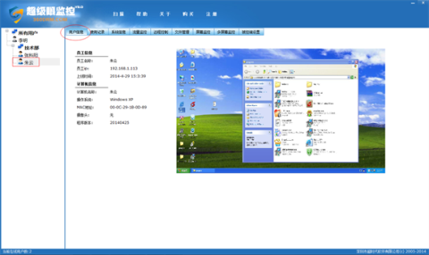 2)查看电脑信息。在左侧列表选择需要查看的员工,单击“用户信息”可以查看该员工电脑的信息,包括该电脑使用者的员工姓名、IP地址、上线时间(可用作考勤)、操作系统、是否有摄像头等。