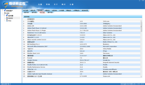 11)运行软件监控。可以查看员工电脑当前运行的所有软件,包括软件名、软件版本和软件开发者。