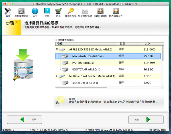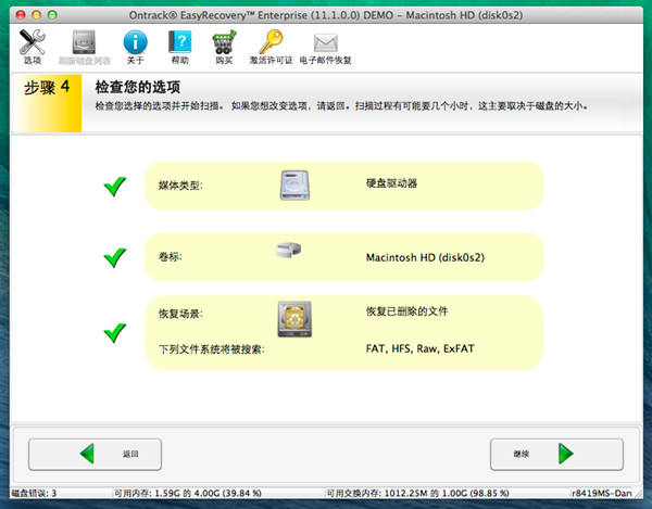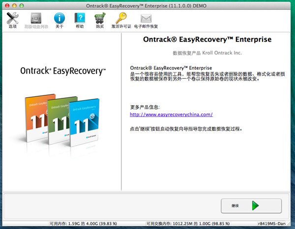 当你第一次运行EasyRecovery的时候可以体验EasyRecovery for Mac免费版,点击“继续”按钮启动恢复向导指导您完成Mac数据恢复过程。